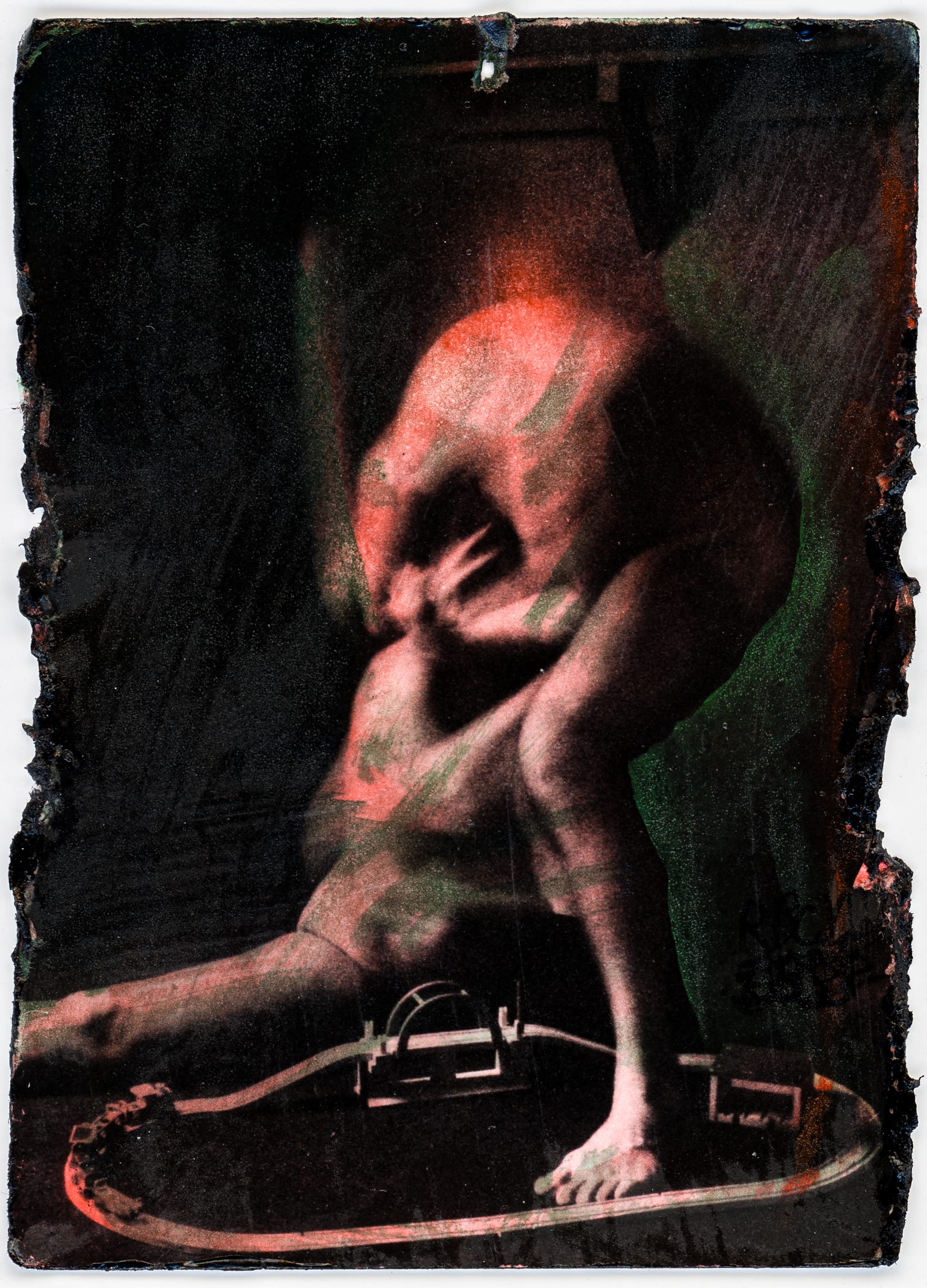 The underprint is from a shoot I did with Ano and wooden trains decades ago. A few years back. the underprint hung on the fence at the Desert Dairy for a couple of weeks which aged it considerably. I used washes of acrylics to bring color into the black and white image. Mixedmedia, 2.5x3.5"