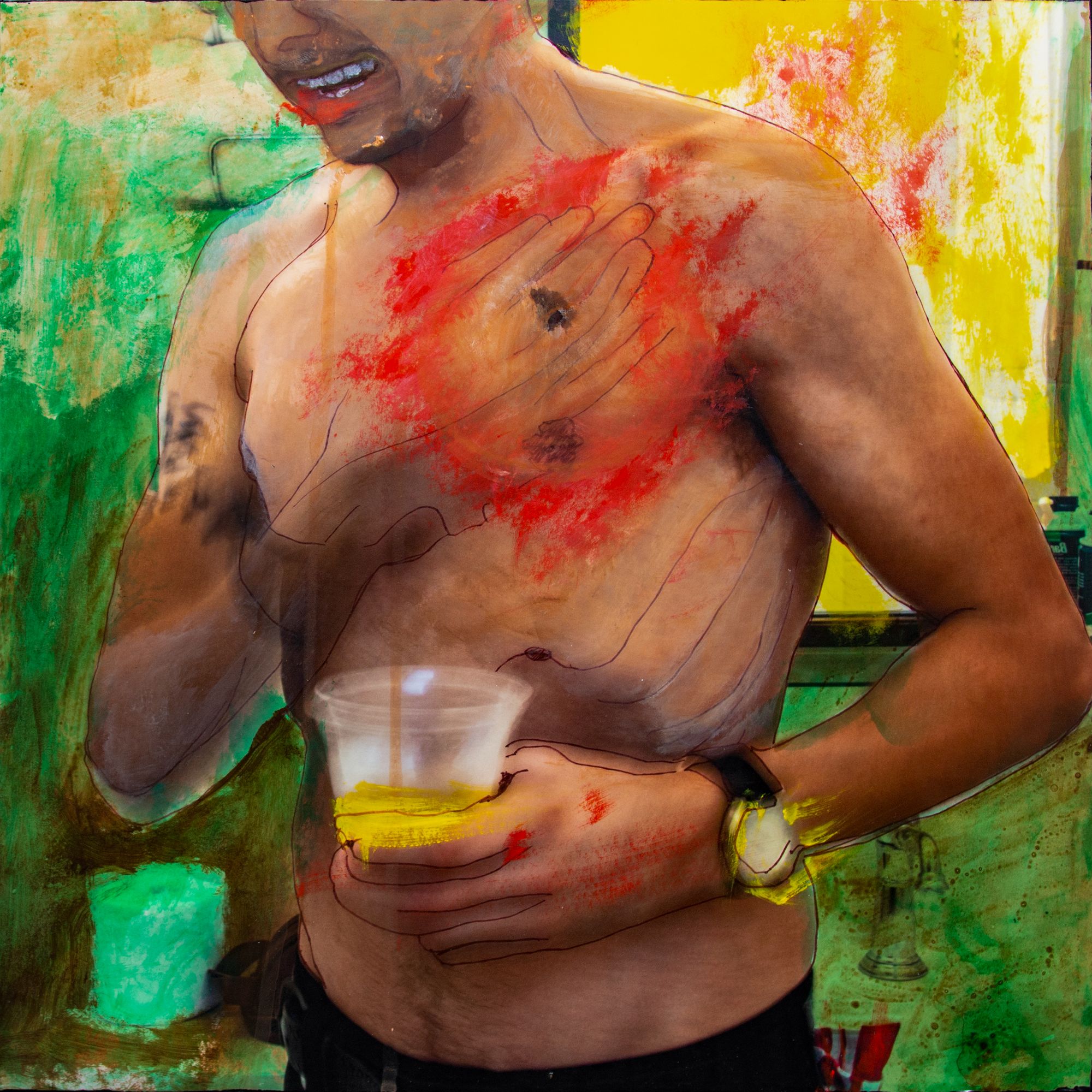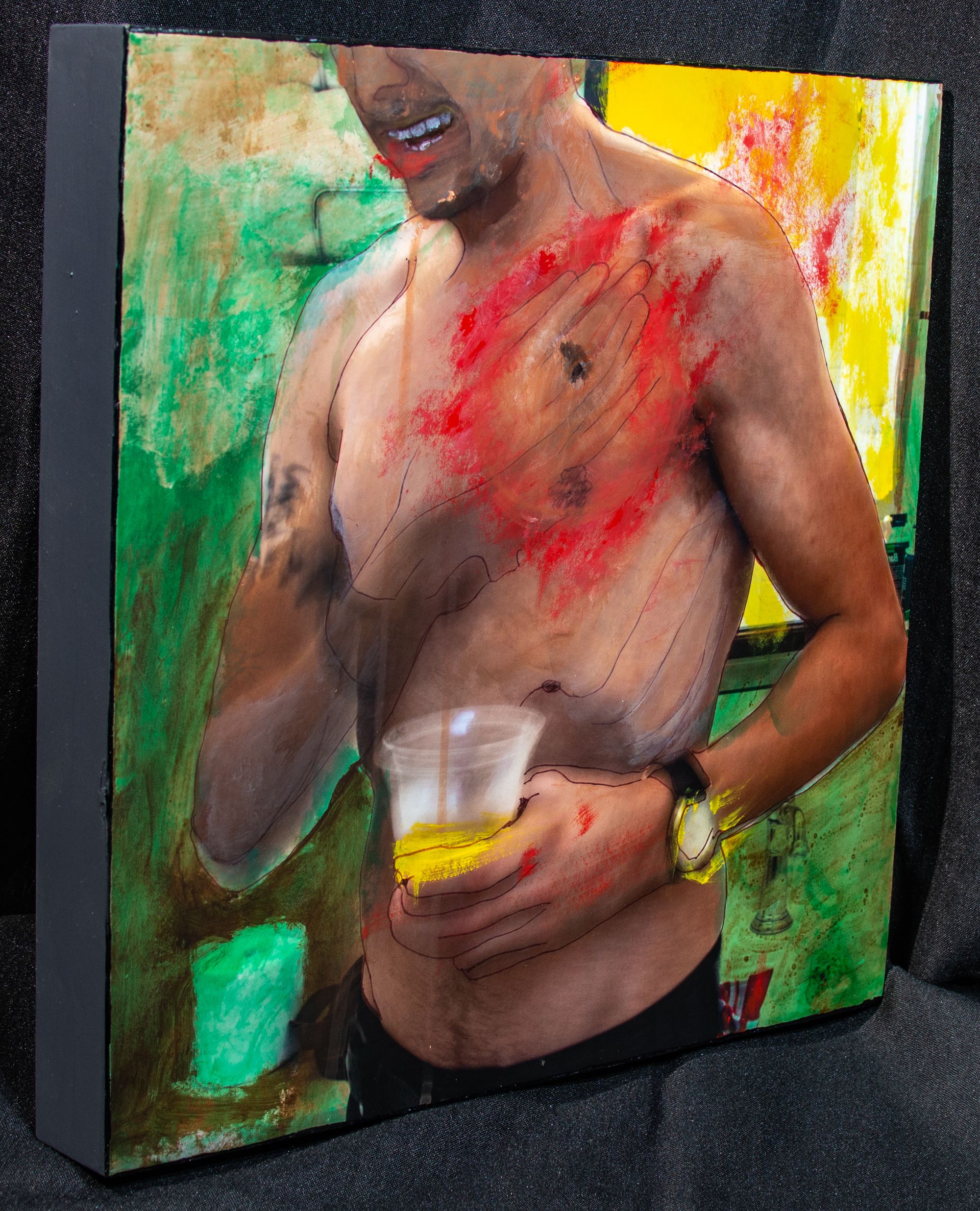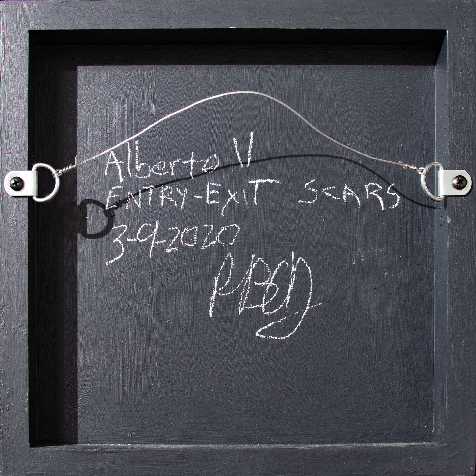 AV has a scar in the front and a bit lower in the back. This shoot took place in room 110 of the Lafayette Hotel during the Hotel/Motel Unofficial Art Fair 2018. 12x12x1.5" mixed media, acrylics, micron pens, and underprint.