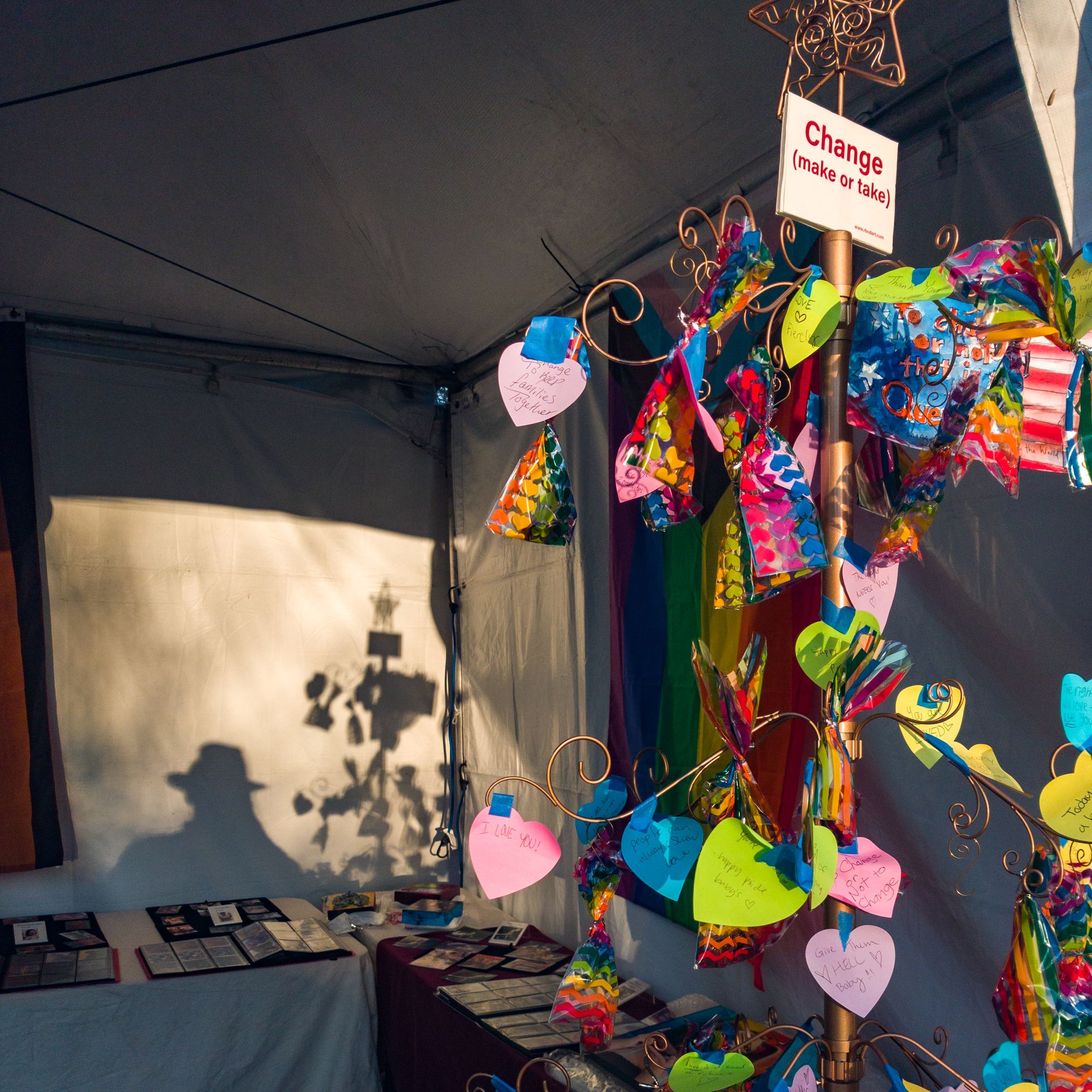 Maria and I developed the idea, gave it a try in Hillcrest and then put it up at Art of Pride 2022. People wrote notes, took pennys, and then posted on the tree. Money (and notes) flowed on and off the tree for two days leaving about $25 extra.