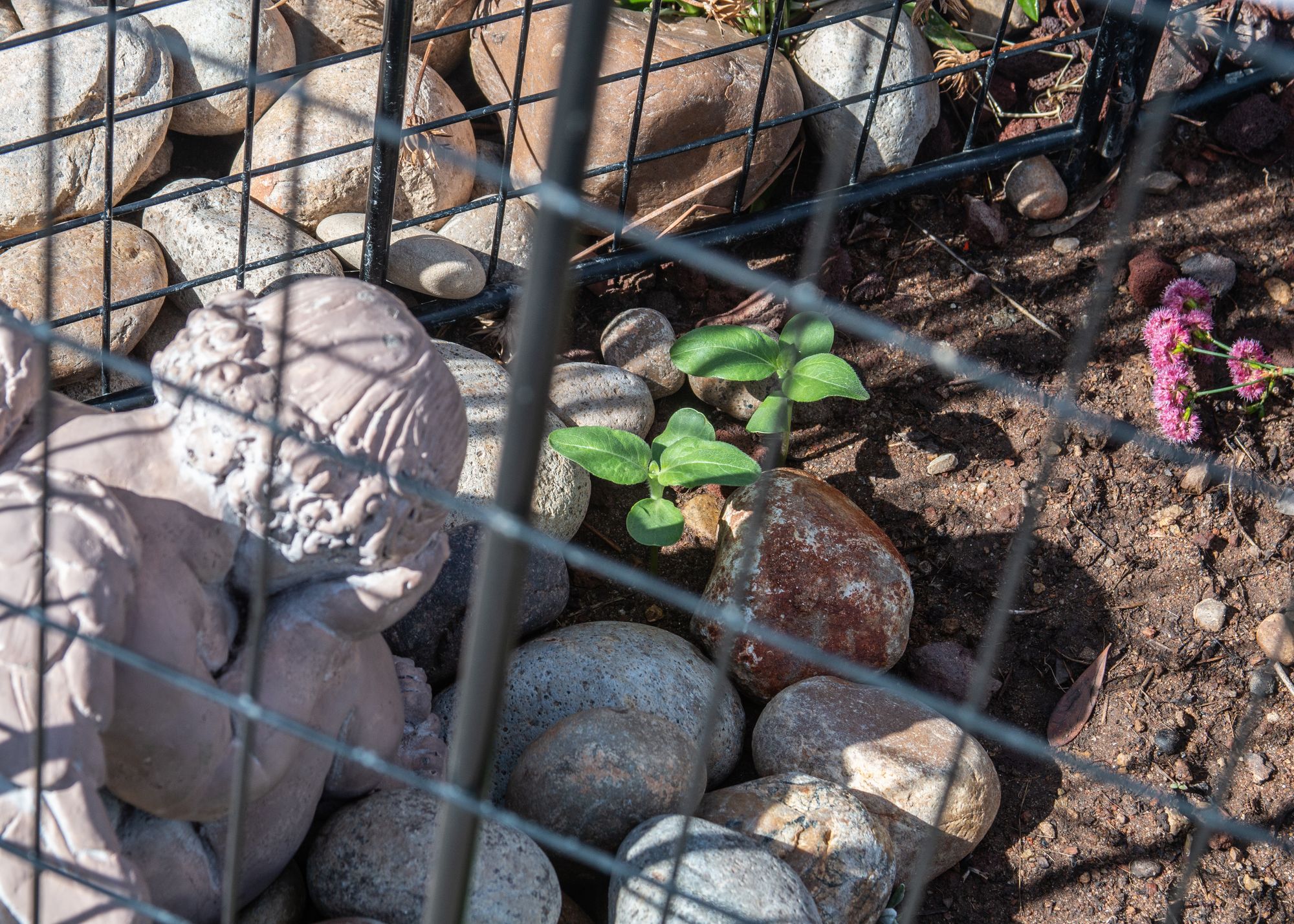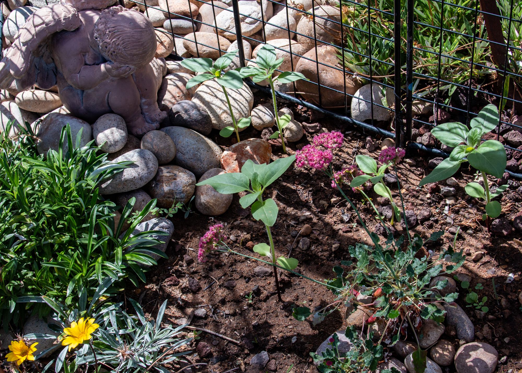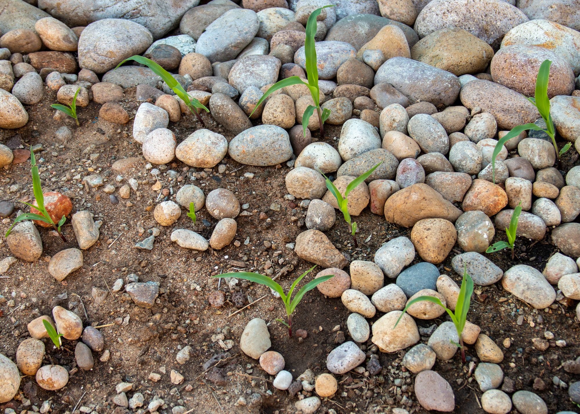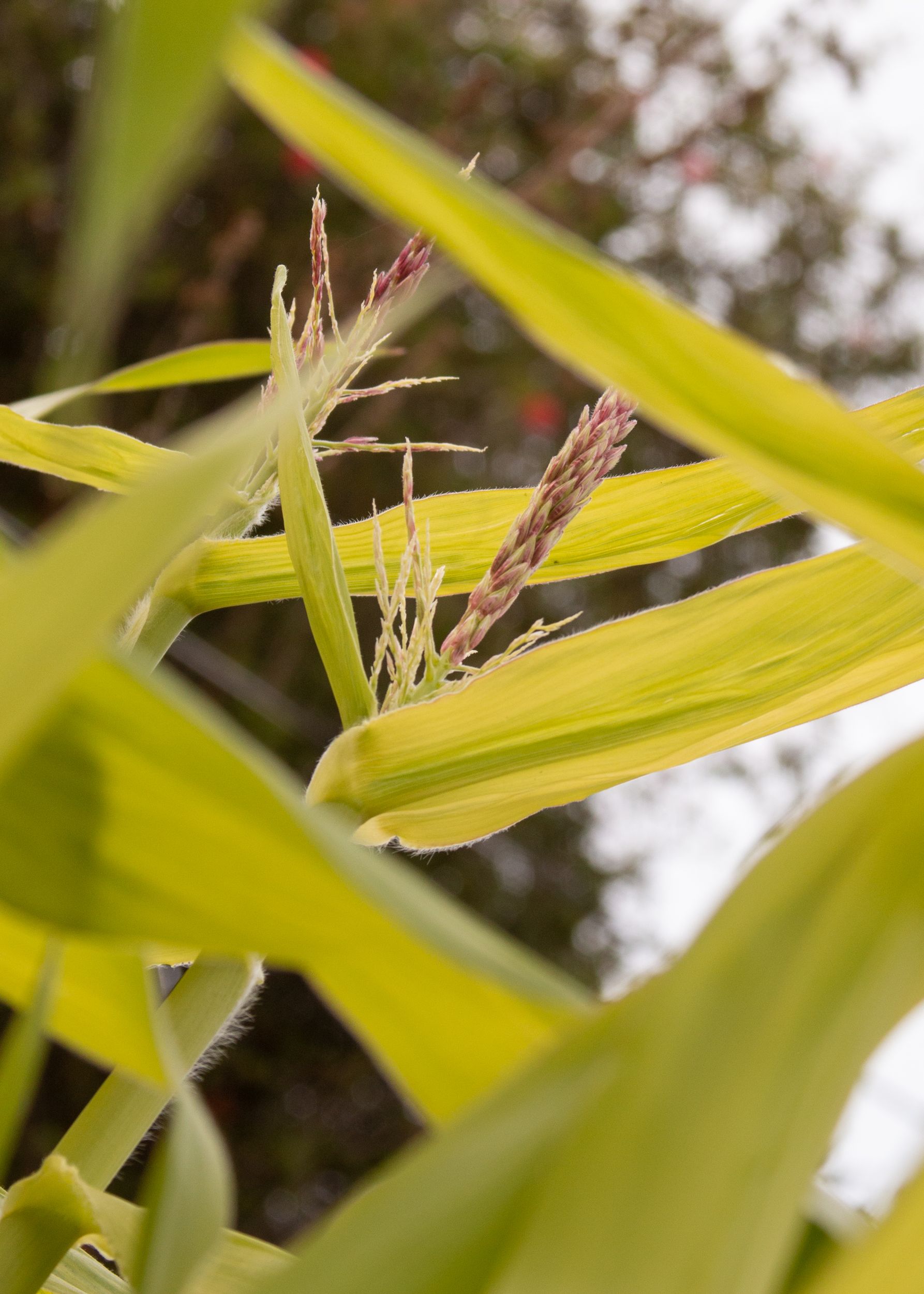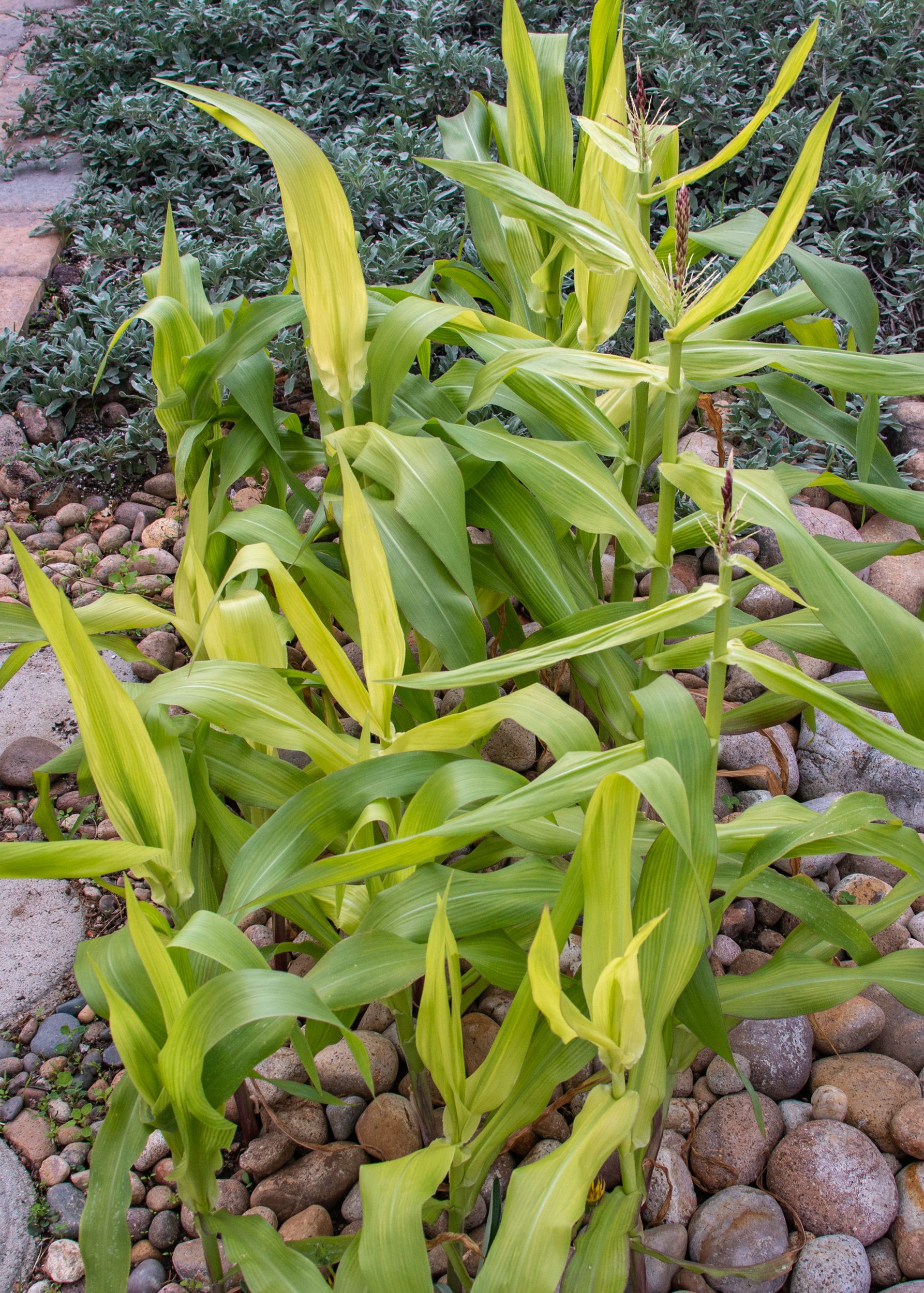 Corn has flowered inside and outside the cage but the stalks are stunted. Rob Dower suggested nitrogen and it restarted the corn and created blossom. We will get some corn from the plants outside the cage, inside probably not.