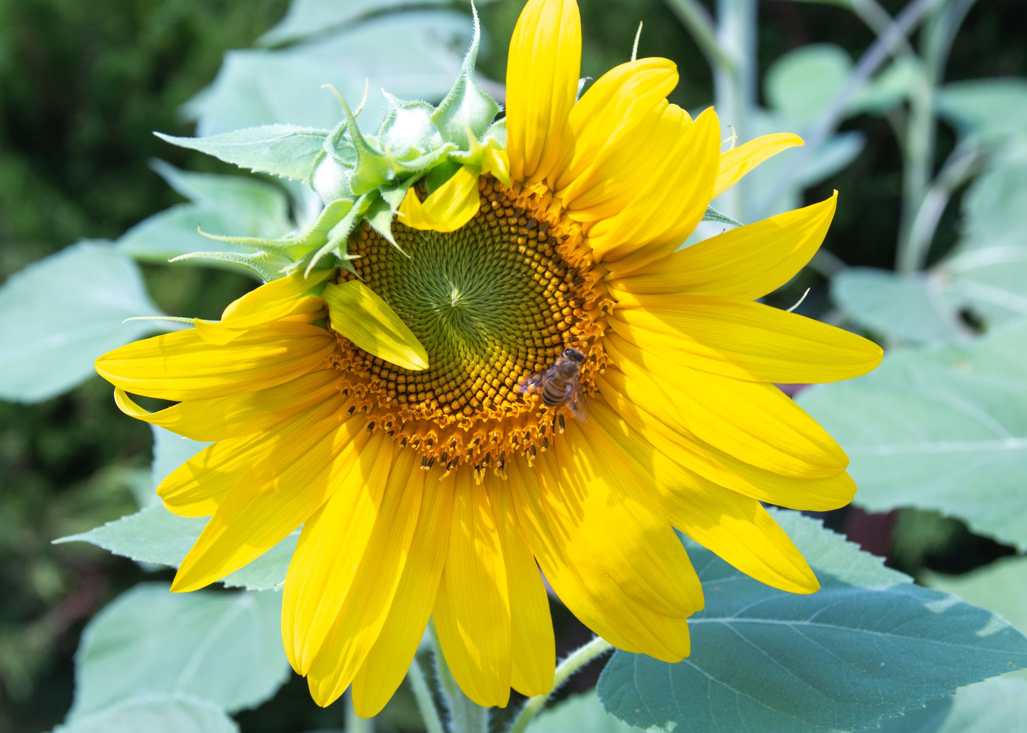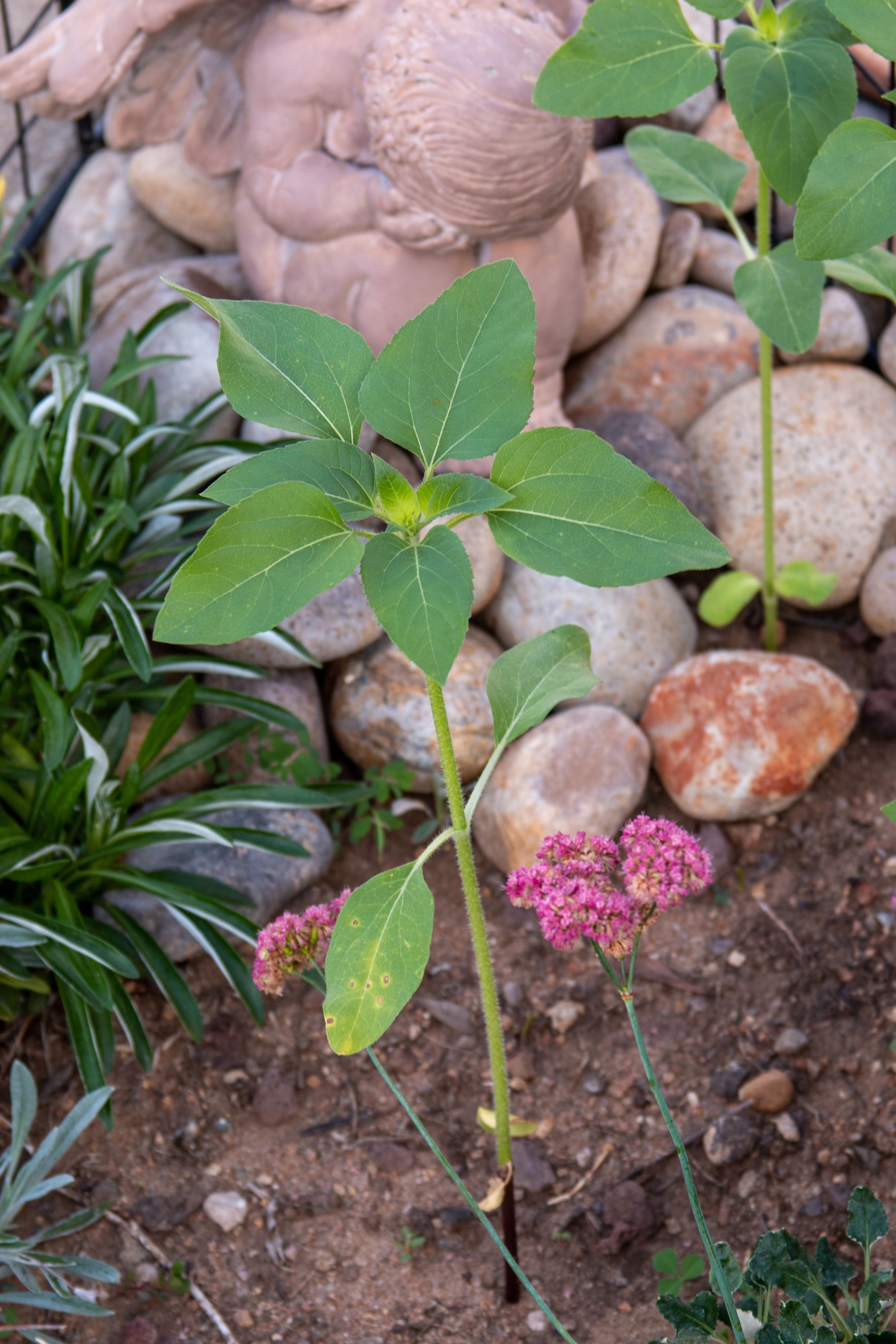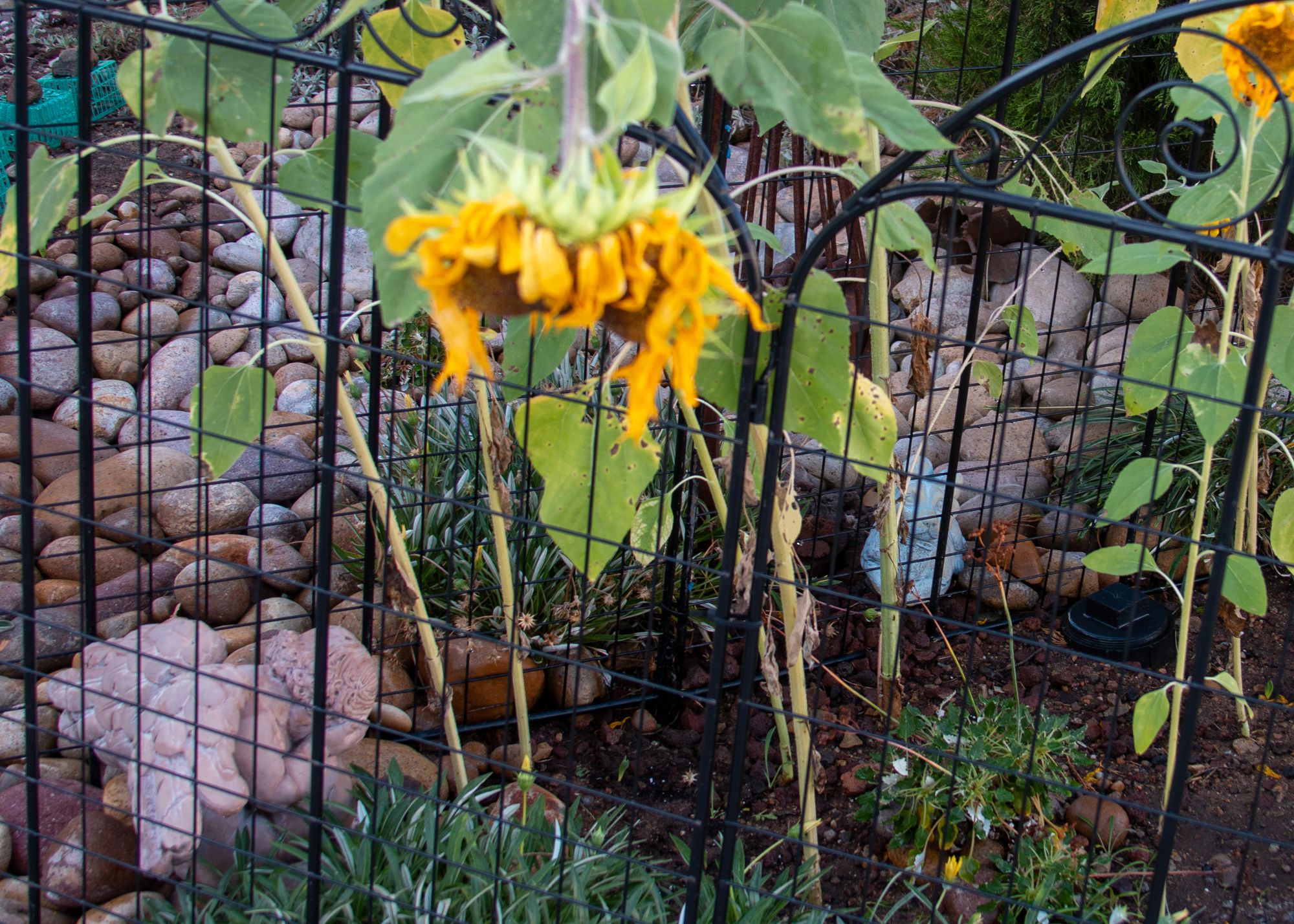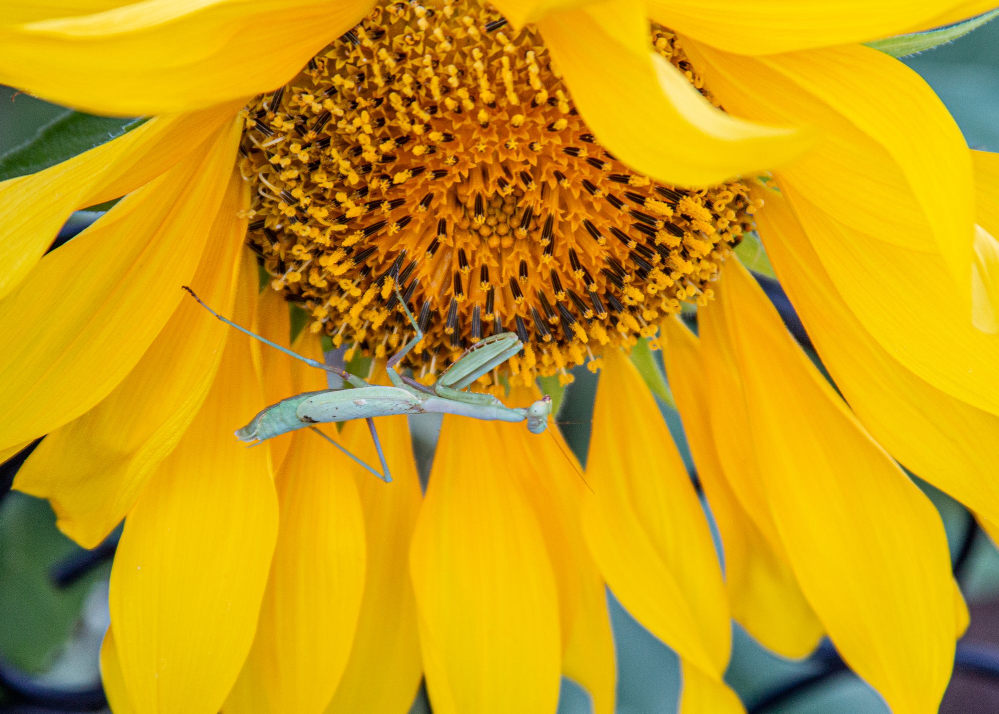 Praying Mantis adopted a sunflower and stayed there for days. Bees don't visit so much. Last year a grasshopper did the same thing quietly eating the green leaves around the flower. Maria planted corn to replace the dying sunflowers