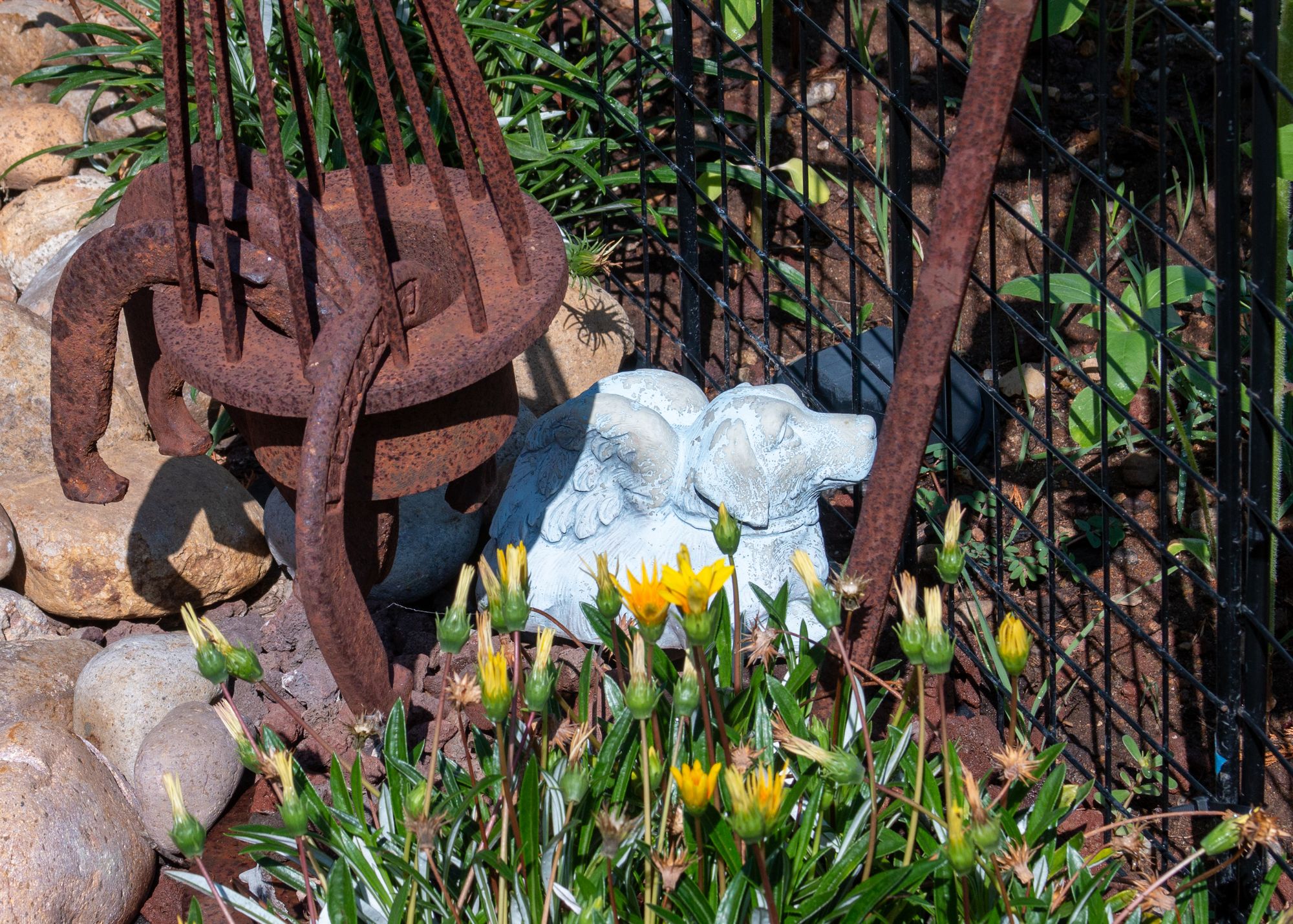 Using leftover fencing, a crying angel, Diane Dancers welded iron and rusting sculpture. Things in the household, an assemblage talking about pain and grief. Pain is the base of the work, hopefully it will incorporate some joy with time.