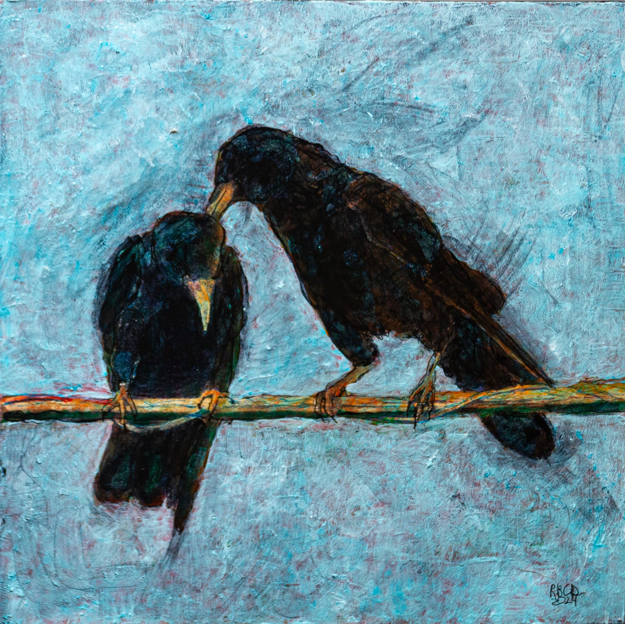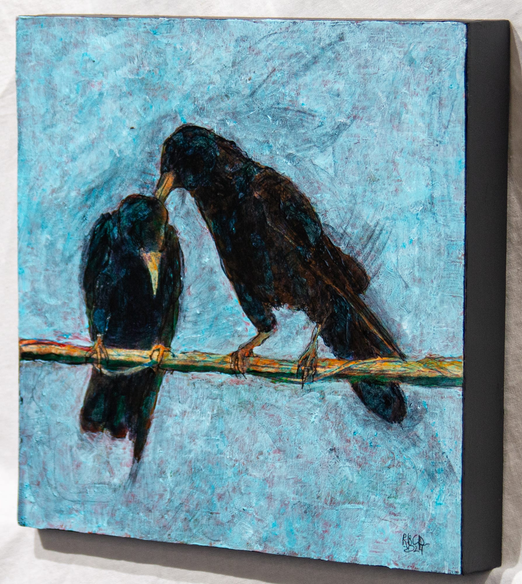 Croaky was a young crow that came down and befriended the Davis family (over the objections of his(?)parents. I like to think that latter on he continued being sociable with fellow crows. Dodie claimed this one very early in the process. 10x10x1.5 Mixed Media: underprint, micron pens, acrylics, two coats of Liquitex gloss varnish.