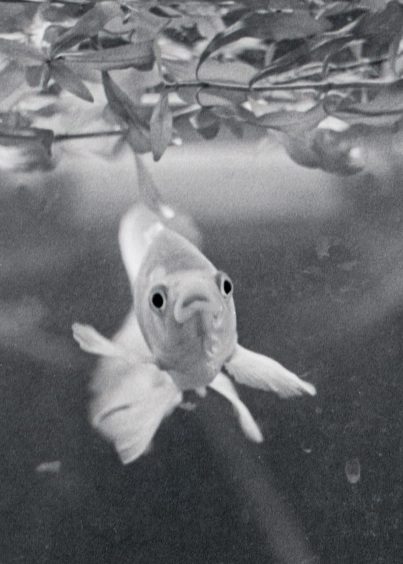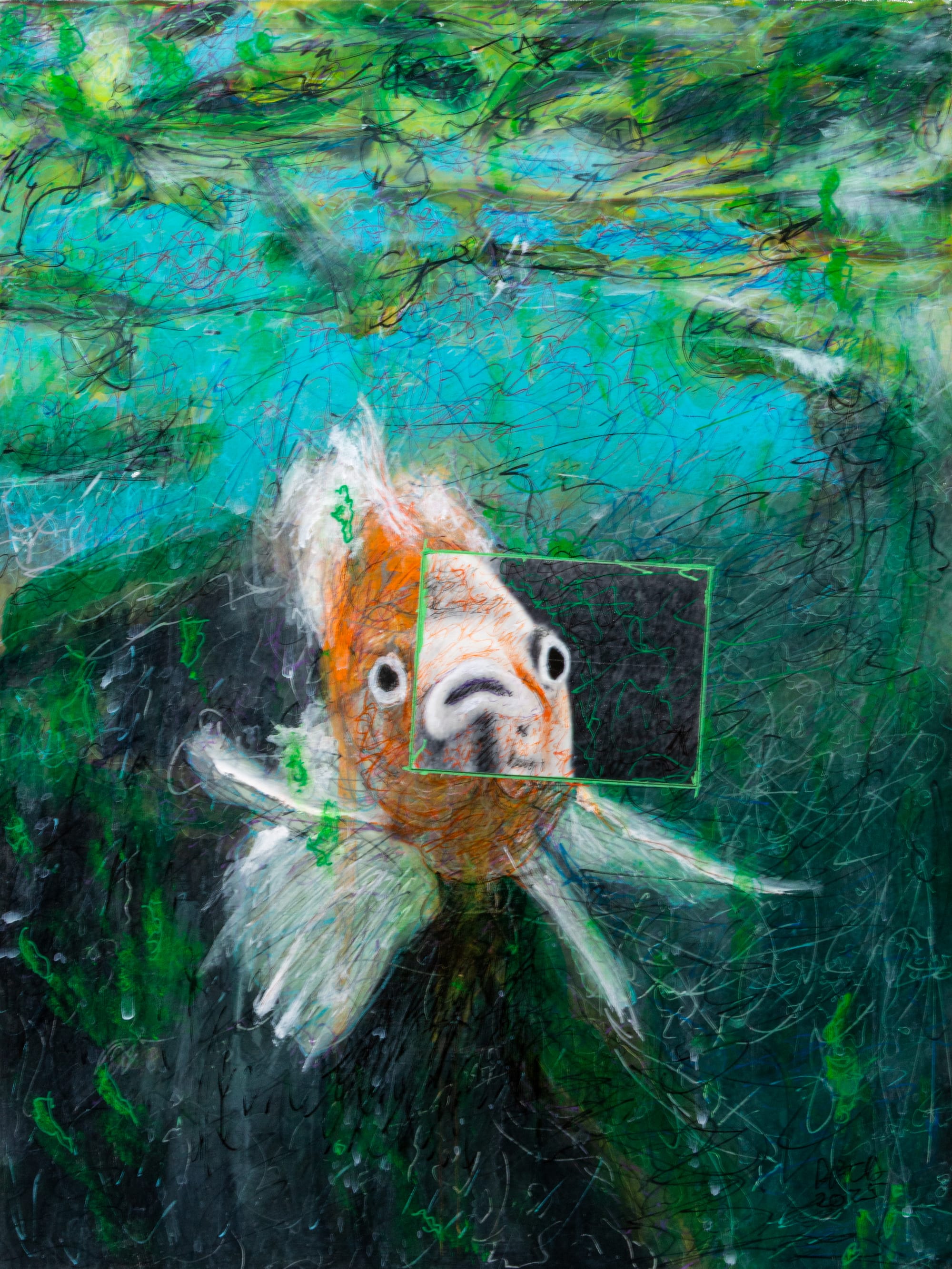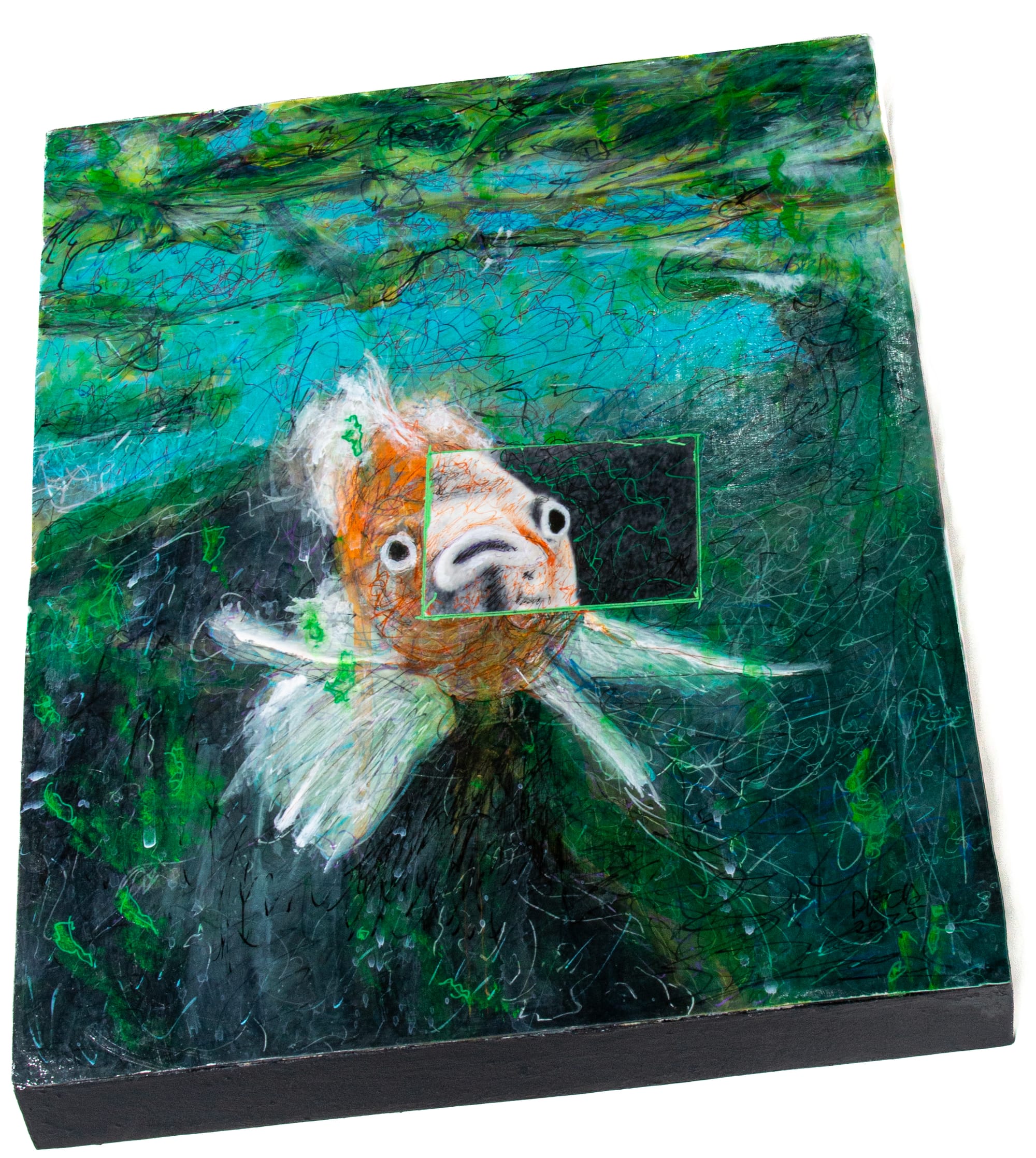 The underprint is a black and white photo I took of my goldfish decades ago in Santa Barbara. I have nearly always had goldfish. Only recently I switched to Koi. This piece has layers and was completed using Micron and Posca Pens, F&W ink, acrylics and 2 coats of final varnish. I was asked in a Zoom peer review what I call my technique. 'Scribbling, I call my technique scribbling.' 12x16x1.5" mixed media mounted on cradled hardboard. the underprint was printed on heavy wt Epson Hot Press Natural paper using archival inks.
