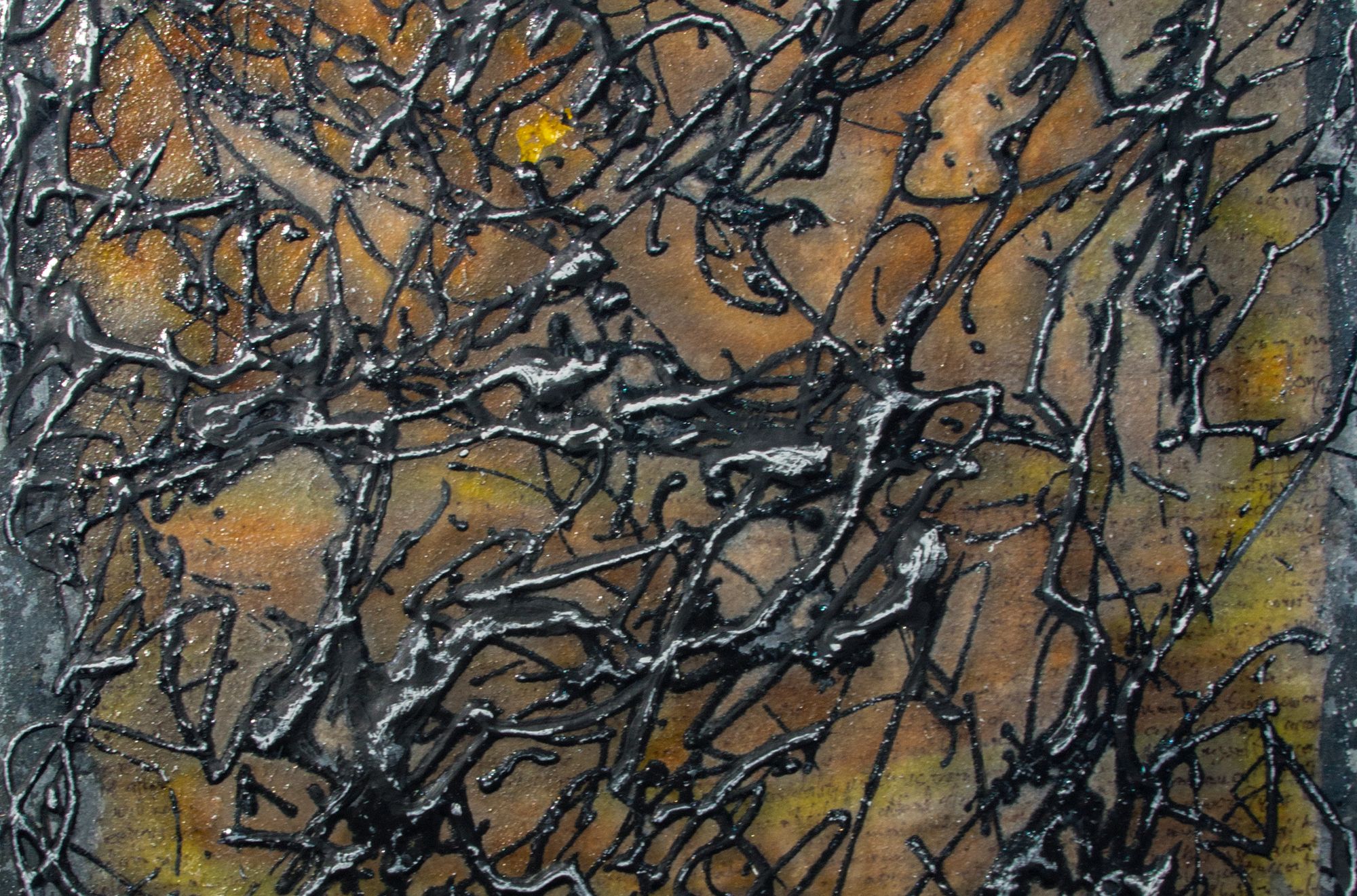 Peeling is where I take the surface off a piece in part or whole. Often it is a finished piece. I do this because the paper left behind is wonderful to work on. The first couple times I did abstracts relishing the action between paint, pens, and Paper.