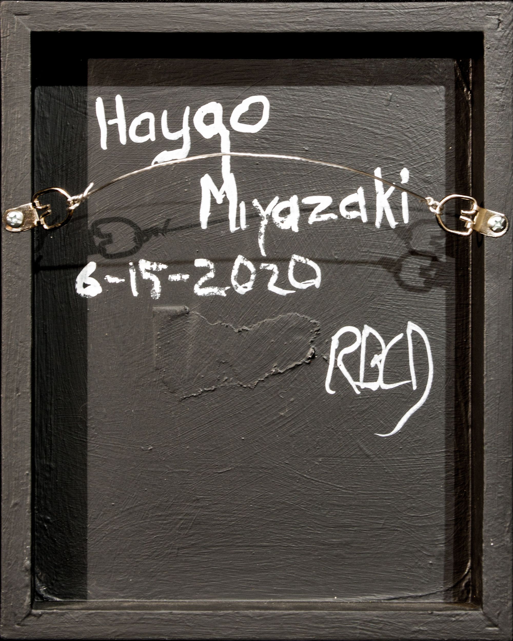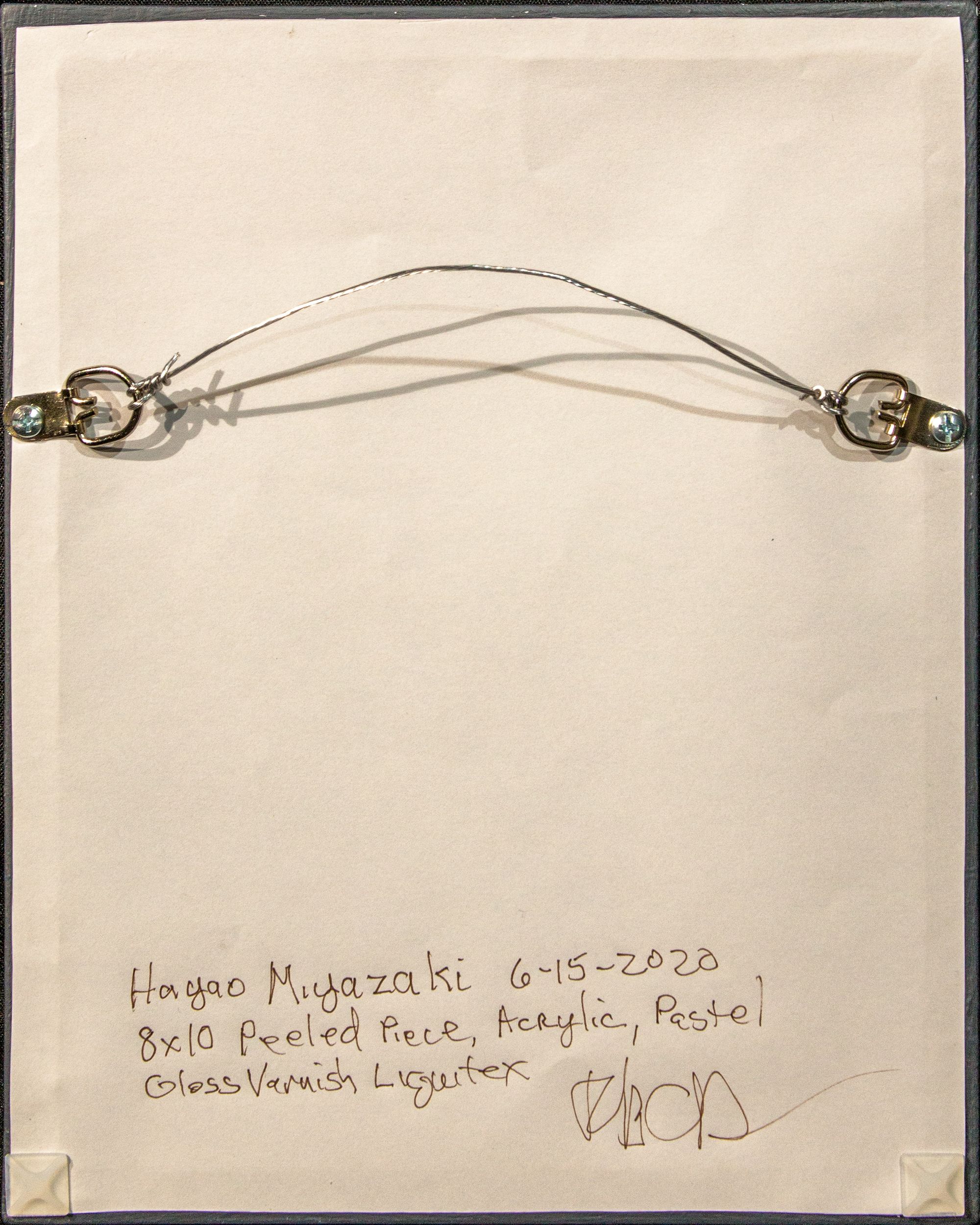This is a peeled piece. The original was also a portrait of Mr. Miyazaki. The piece peeled off unevenly, sometimes down to the wood. Sometimes leaving paper. Black lines penetrated through.