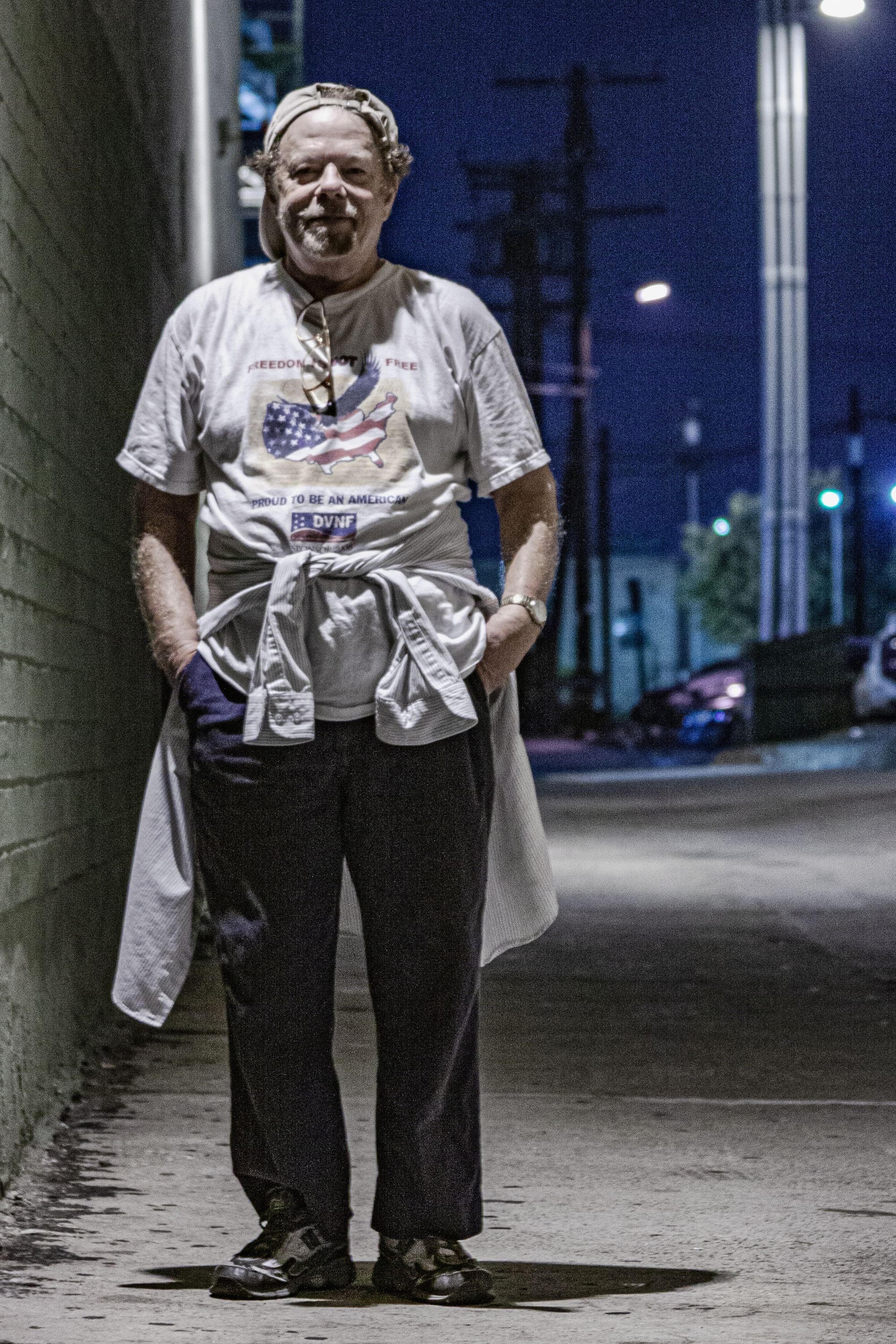 I did receive some donations. Several wonderful images were created. For this post, I have color corrected, applied all sorts of fixes, and given the images a color and brightness that was not discernible in the low and very unbalanced light of the venue. Here is a picture of myself, Hank, and the two alleys we worked in off Ray St.