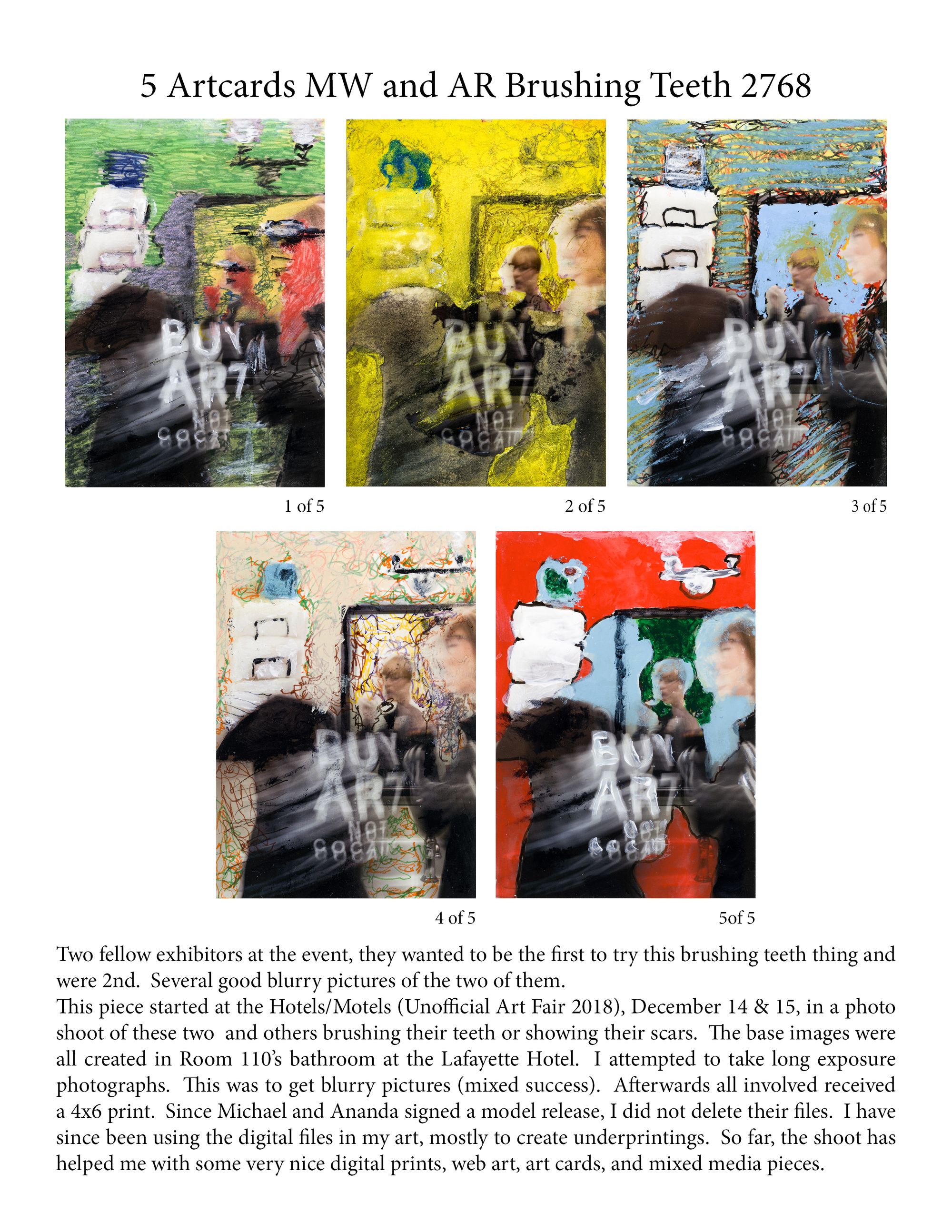 So glad these two ran over from their exhibition and participated. The short shoot at the Lafayette Hotel with them during the Hotel/Motel Unofficial Art Fair has been the core of many different art cards and larger works. Posted the front of each art card in this series below.
