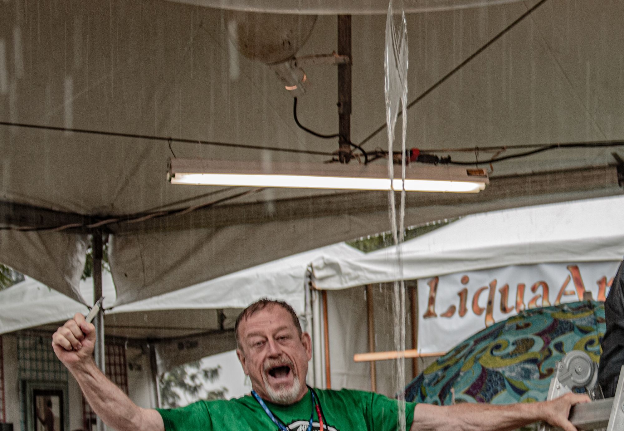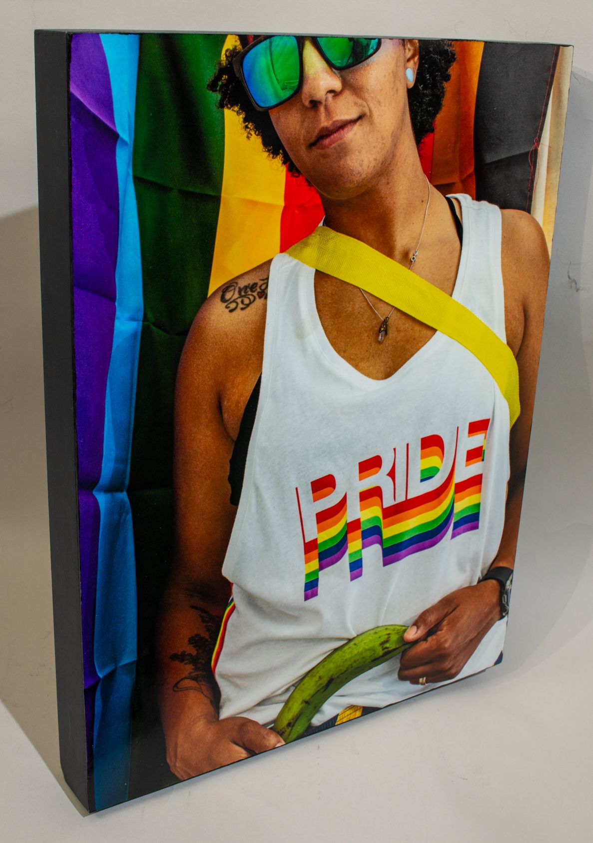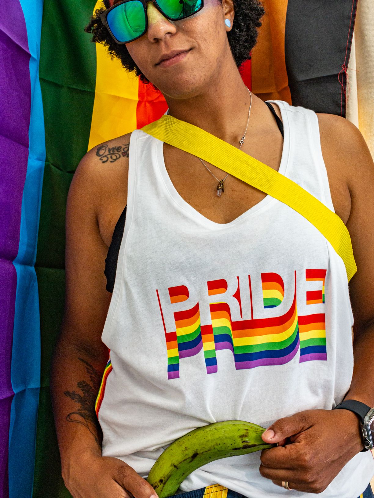 Paige, head tilted, wearing sunglasses, a sleeveless Pride t-shirt, and holding a plantain stuck in their jeans. 2019 Art of Pride in the San Diego Pride Festival. Trying different poses with a banana for the fun of it. 2019 Images of Pride Exhibition.